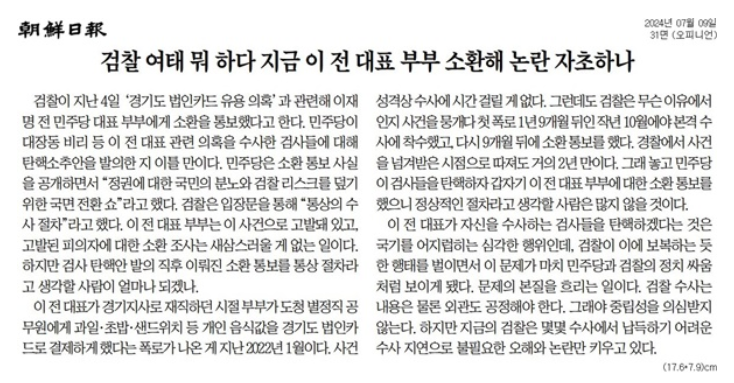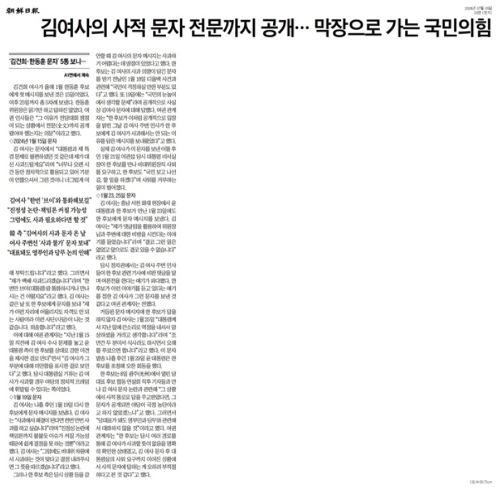 - 조선일보 3면: "김여사의 사적 문자 전문까지 공개… 막장으로 가는 국민의힘"
