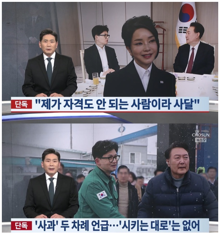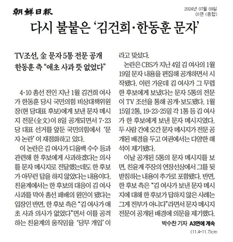 - 조선일보 1면: "다시 불붙은 '김건희·한동훈 문자'"