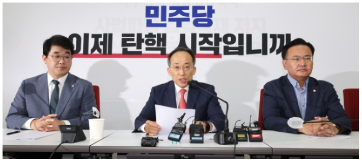 추경호 국민의힘 원내대표는 국회 법제사법위원회가 윤석열 대통령에 대한 탄핵 청문회 안건을 심사하고 김건희 여사와 그의 모친을 증인으로 부르기로 한 데 대해 강하게 비판했습니다. 추 원내대표는 민주당의 이러한 행동이 헌법과 법률을 무시하는 행위라고 지적하며, 문재인 대통령 탄핵 촉구 청원과 비교하면서 이중잣대를 비난했습니다.